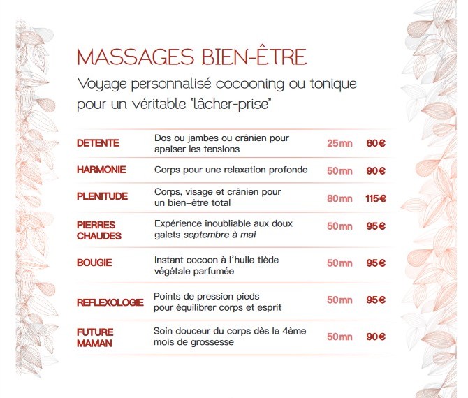 ♦ ENTREES SPA ♦ MASSAGES BIEN-ÊTRE ♦ COCKTAILS DE SOINS ♦ SOINS EN DUO